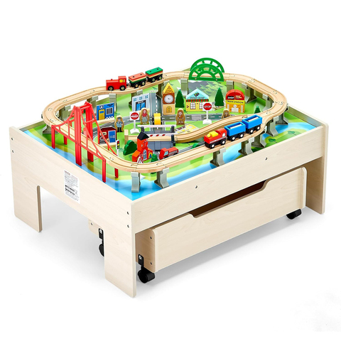 Multifunctional Kids Train Table with Track Set, Wooden Play Table for Toy Cars & Building Block Games